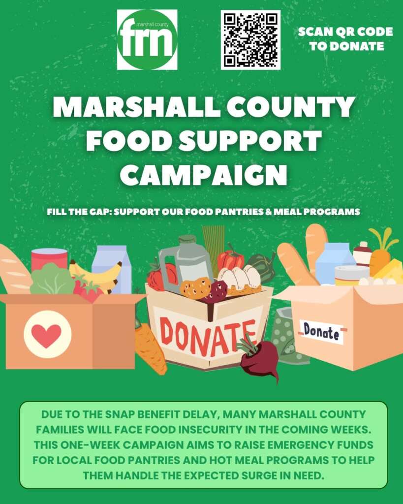 Due to the SNAP benefit delay, many Marshall County families, especially the 1,500+ children who rely on these benefits, will face food insecurity in the coming weeks. This one-week campaign (October 28th – November 4th) aims to raise emergency funds for local food pantries and hot meal programs to help them handle the expected surge in need. Just $10 can help provide groceries or a hot meal for a family in need. Every amount helps!