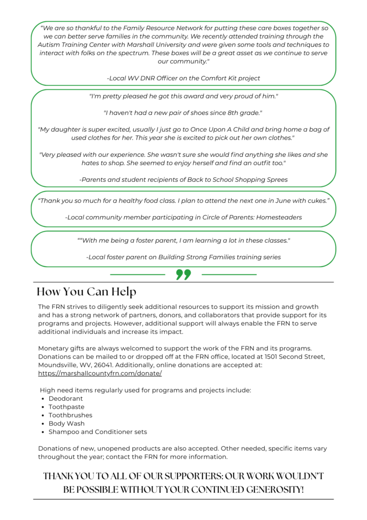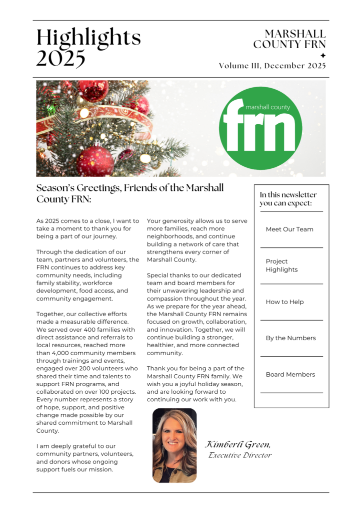 The Highlights of 2025 can be viewed below or by clicking here: https://marshallcountyfrn.com/wp-content/uploads/2025/12/Highlights-2025-12.2.25.pdf