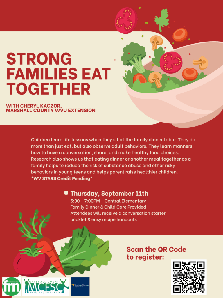 September kicks off the second half of our Building Strong Families Parent Education Series! Join us for a free evening focused on strengthening families through shared meals and meaningful conversation with instructor Cheryl Kaczor of WVU Marshall County Extension on September 11th from 5:30 – 7:00PM. Each family will receive a conversation starter booklet and easy recipes handout to take home. Childcare and a family dinner will be provided. *STARS credit pending*